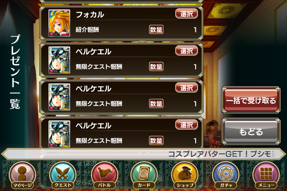 ステージクリア報酬も、Sレアじゃなくなったから、8枚集めるのが難しくなったし、消費するスタミナが10なので何回も回すのがめんどくさいので今回は集めないかな。