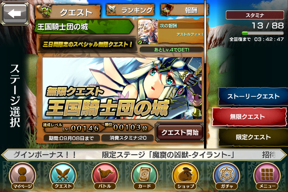 前回の無限クエストは時間がなくて思った通りの結果を出すことが出来なかったので、今回は他のイベントそっちのけで無限クエストだけに専念。