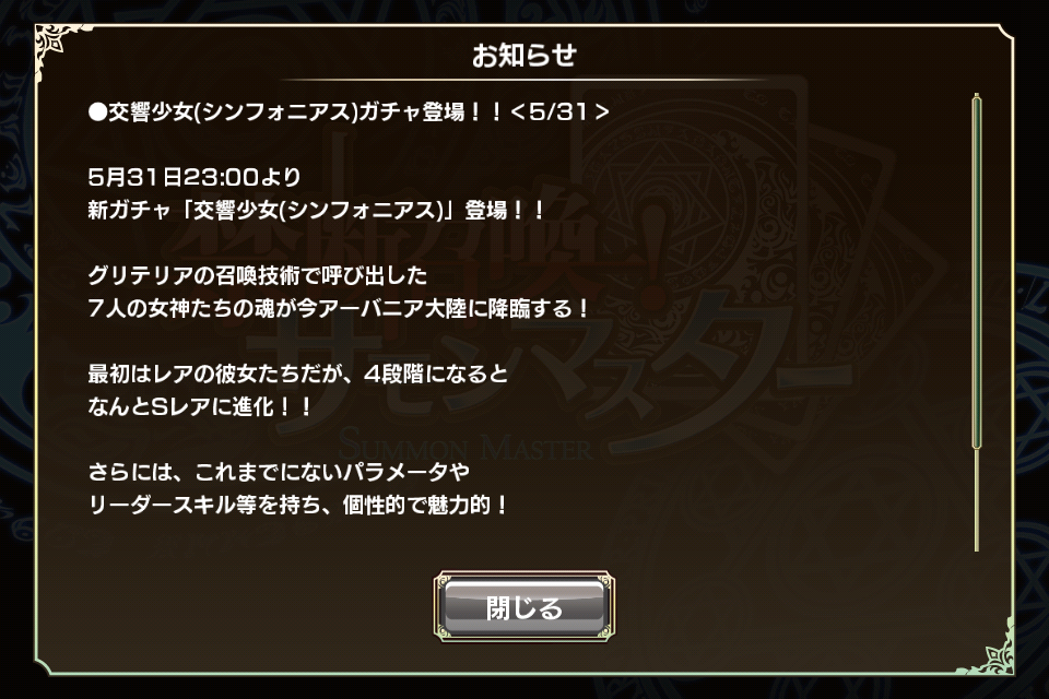 5月31日から、新ガチャ【交響少女(シンフォニアス)】登場するそうです。
